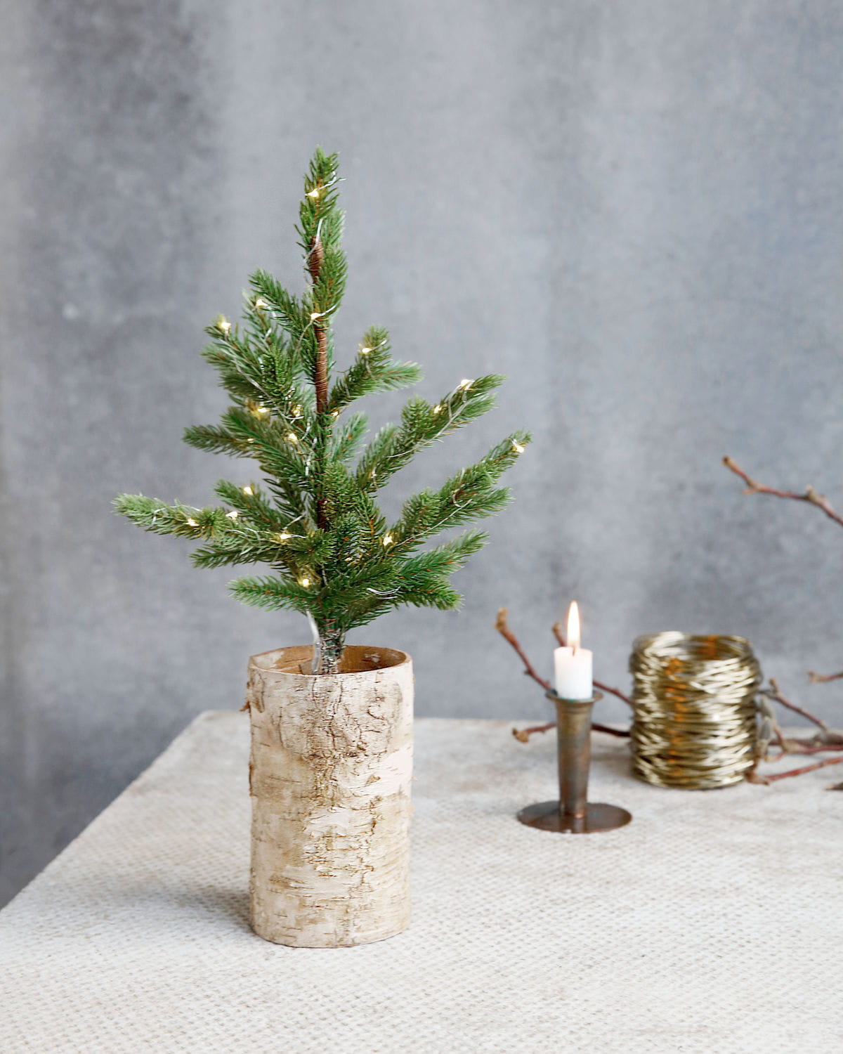 Poczuj świąteczny nastrój dzięki tej pięknej choince od House Doctor. Jego małe, delikatne światła rozświetlą każdy ciemny zimowy dzień. Użyj drzewa, aby stworzyć ciepłą, przytulną atmosferę w swoim domu. Umieść go na komodzie w salonie lub na parapecie w kuchni lub przedpokoju. Drzewo jest wykonane z materiałów syntetycznych, dzięki czemu będzie można je ponownie wykorzystać w przyszłym roku. Drzewo stoi wysokie na ładnej brzozowej podstawie, która ma rustykalny wygląd. Baterie nie są dołączone (potrzebne są 3 baterie AA). Do użytku wewnątrz.