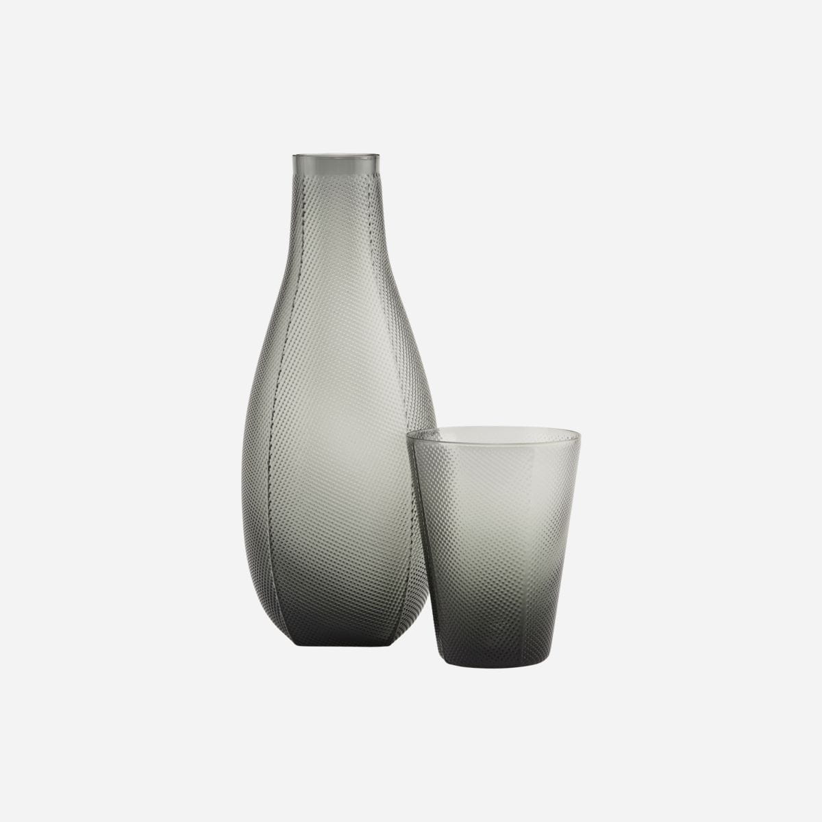 MILO carafe by House Doctor is a great element - both decorative and practical. A set of carafe with a glass will enrich our interiors at home and at work. The glass included in the set additionally serves as a lid - it protects water from dirt. The whole set is made of light, smoked glass covered with texture in tiny dots. A very simple yet impressive design element.