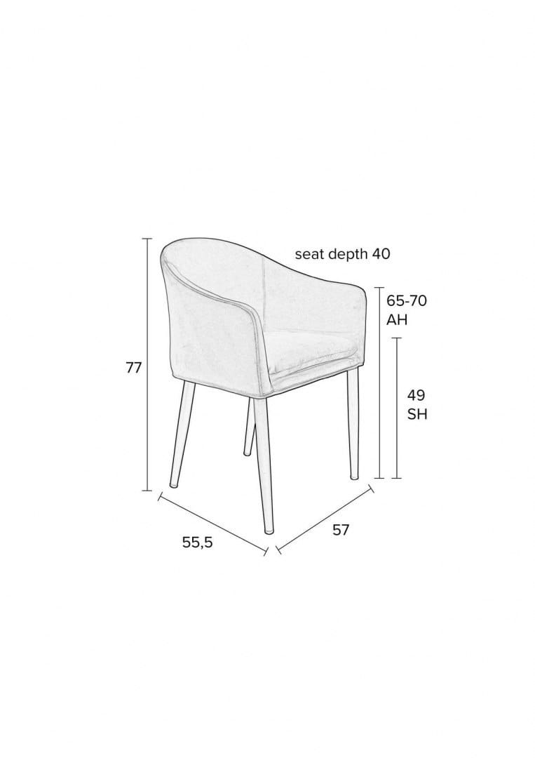 > 20,000 Martindale, color fastness 4-5 Seat cushion with removable cover Powder coated black steel legs Black colour Material: 100% polyester fabric. Plywood with PU foam. Steel legs powder coated in black Dimensions: 57x55.5x77 cm Armrest height: 65-70 cm Seat height: 49.00 Seat depth: 40.00 Maximum load: 120 Weight: 7.90 Packaging dimensions: 58x53x42(kg)10.5 EAN: 8718548038615 Seat width: 37.50 Length: 55.50 cm Width: 57.00 cm Height: 77.00 cm Mass: 7.9 Available from: 2022-02-04 HS Code: 94017100