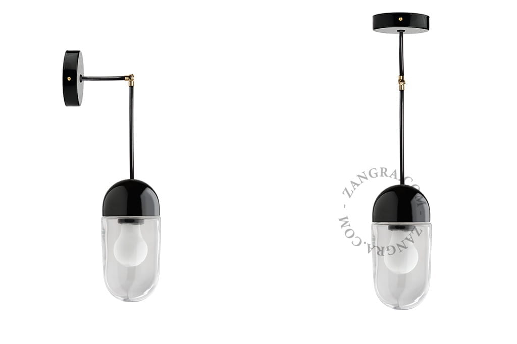 The 004 lamp by Zangra is designed and handcrafted in Belgium. A classic, black, porcelain lamp, rotates 90 degrees thanks to the brass connector. It will add charm and character to the interior.