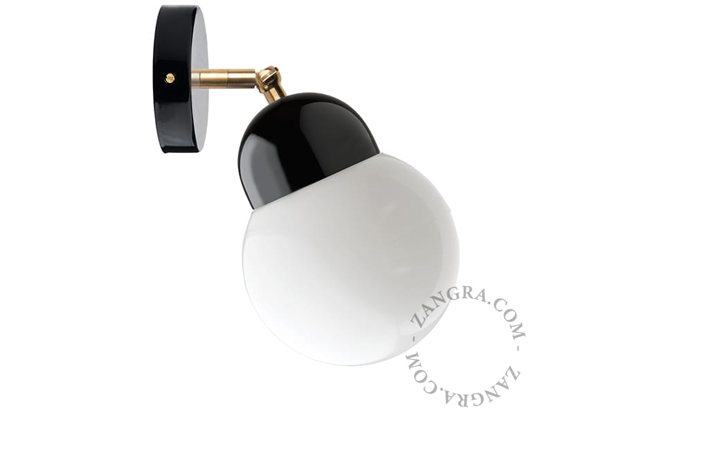 Black porcelain wall lamp from Zangra. The lamp is designed and handcrafted in Belgium. Simple, elegant and timeless lamp will match to any kind of space. Socket swivels 90 degrees on brass fitting.