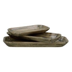 Bambus to surowiec, który można wykorzystać do wielu produktów, w tym misek, naczyń i tac. Jednak tego typu produkt wymaga specjalnego procesu produkcyjnego, w którym bambus moczy się w wodzie przez kilka tygodni po zbiorze, aby zapobiec jego gniciu. Roślinę następnie suszy się i kroi na małe paski, które następnie układa się dookoła lub w formie i formuje młotkiem. Przed polerowaniem przedmiot jest nasączany naturalną żywicą, a na koniec lakierowany. Te talerze RIMBU są lekkie jak piórko i super odporne. Zestaw zawiera trzy talerzyki w różnych rozmiarach.