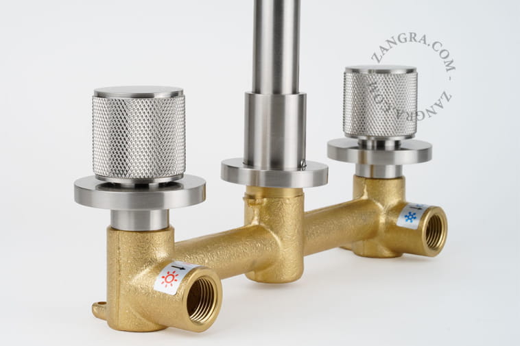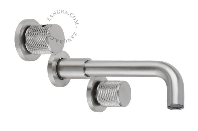 Montowany na ścianie kran wykonany jest ze stali nierdzewnej, a dwa pokrętła ułatwiają kontrolowanie ilości ciepłej i zimnej wody, aż do osiągnięcia pożądanej temperatury.