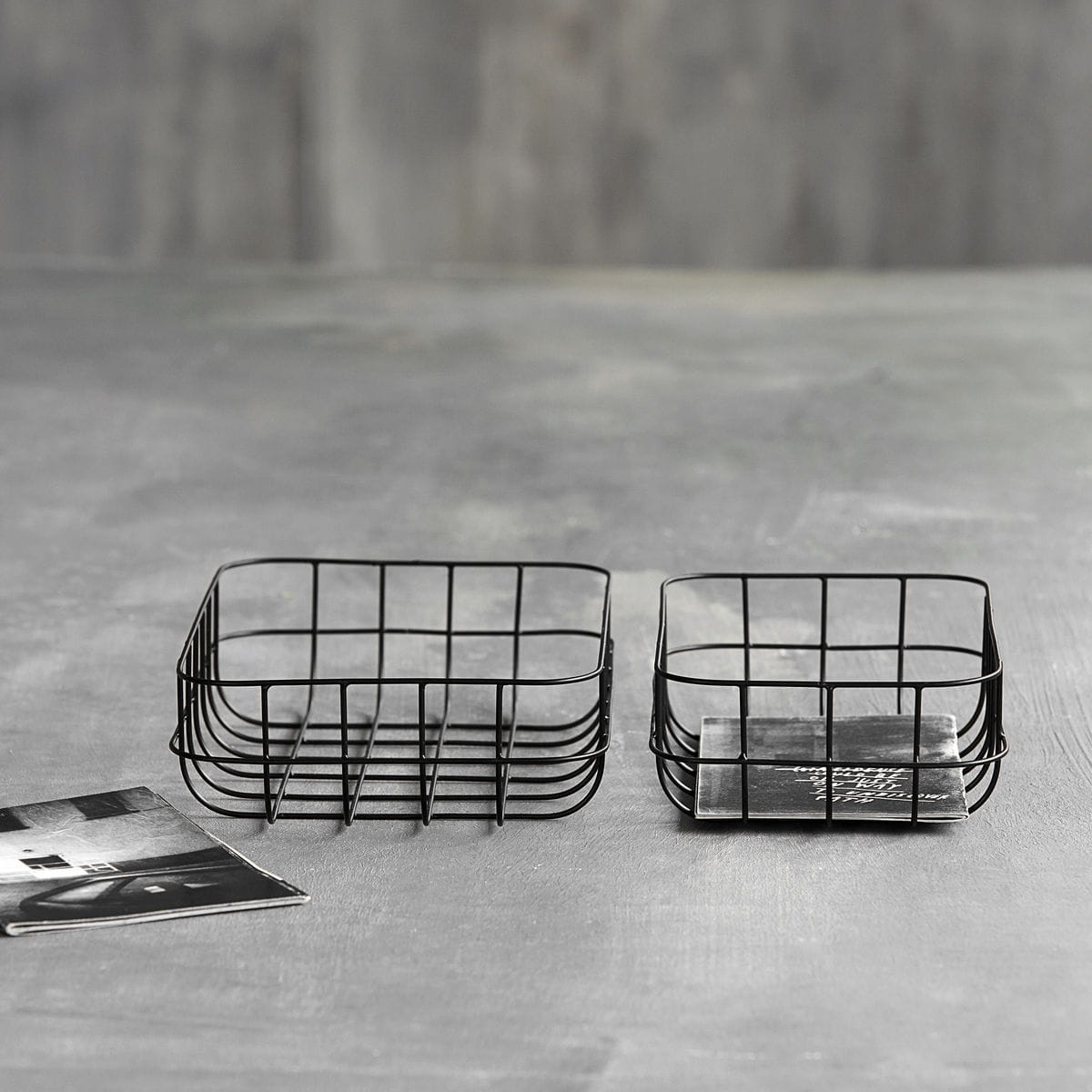 Zestaw dwóch koszy wykonanych ręcznie z metalu, lakierowanych na kolor czarny. Zestaw SIMPLY składa się z koszy w dwóch różnych wielkościach. Kosze pozwolą na uporządkowanie większych i mniejszych drobiazgów.