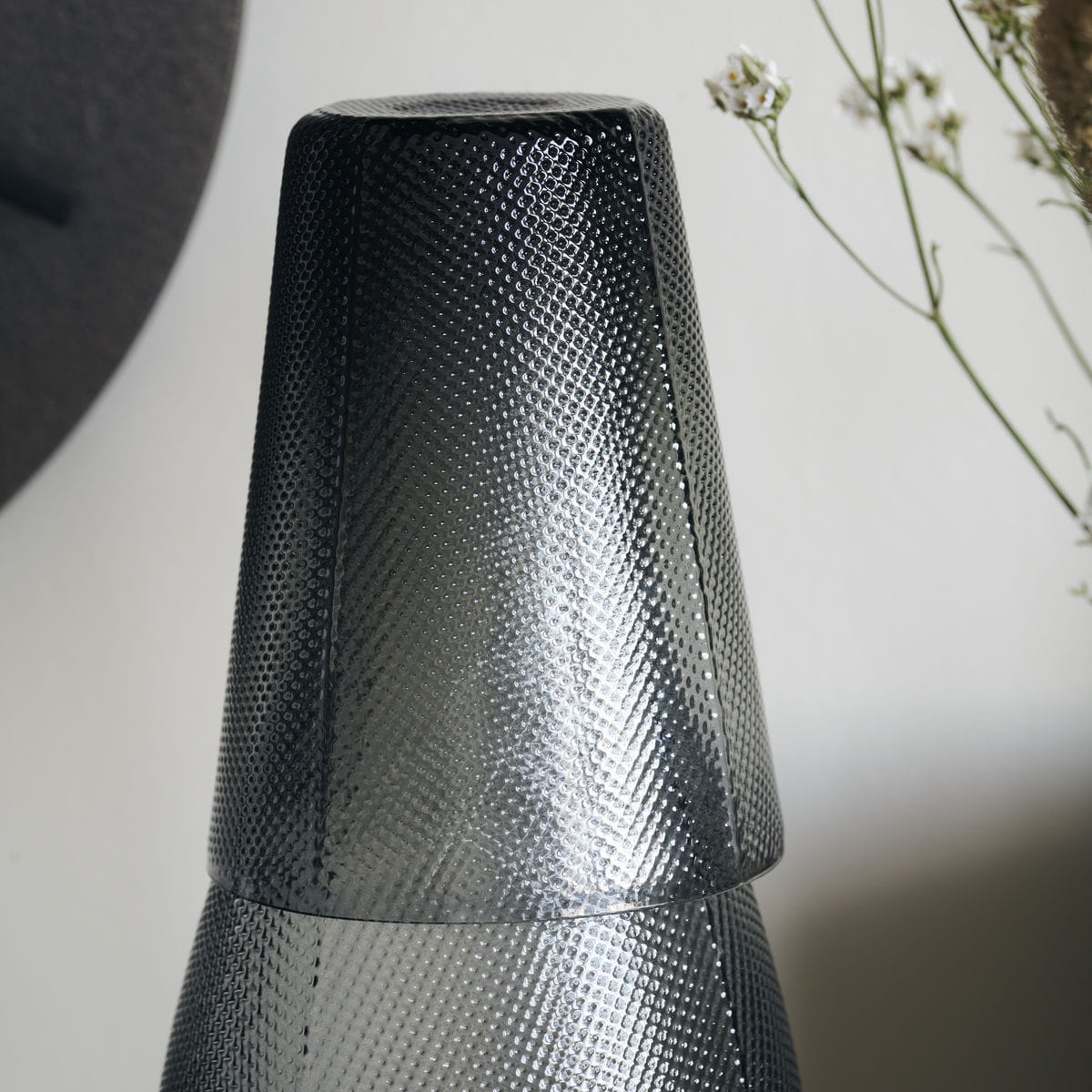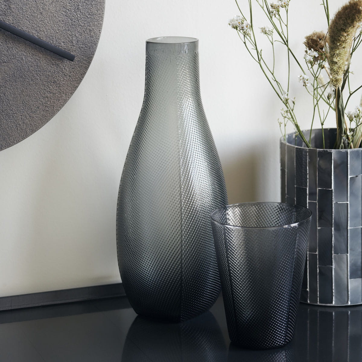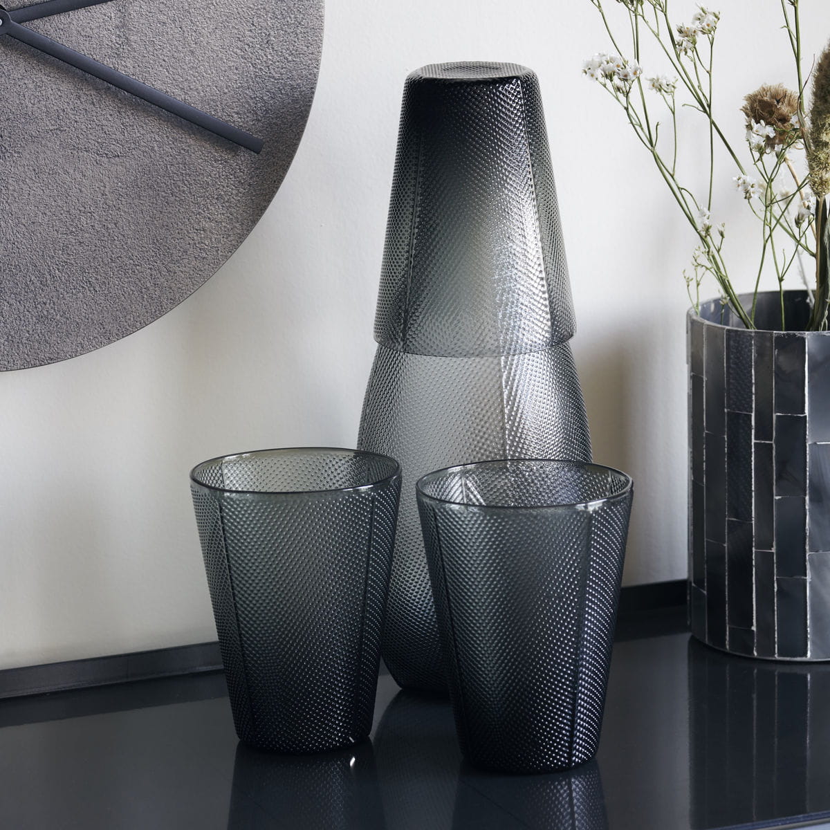 Karafka MILO firmy House Doctor to świetny element - zarówno dekoracyjny jak i praktyczny. Zestaw karafki ze szklanką wzbogaci nasze wnętrza w domu i w pracy. Szklanka zawarta w zestawie dodatkowo pełni funkcję pokrywki - dzięki czemu chroni wodę przed zabrudzeniami. Całość wykonana jest z jasnego, przydymionego szkła pokrytego teksturą w drobne kropki. Bardzo prosty zarazem imponujący element wystroju.