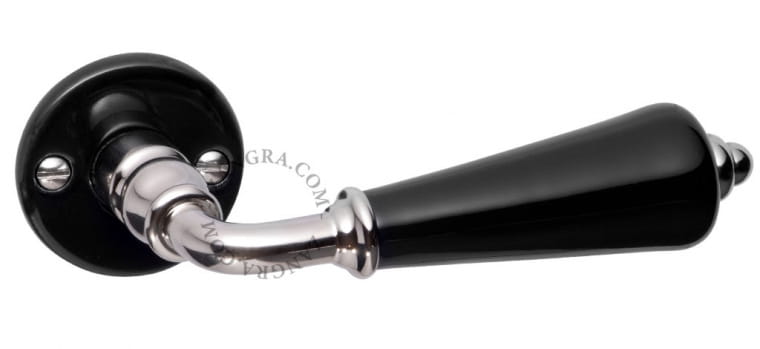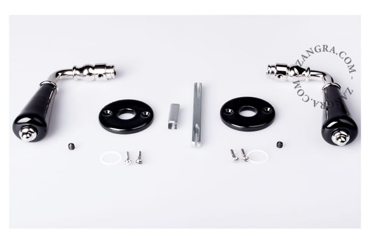 Porcelanowa klamka do drzwi, czarna - Zangra Tato dveřní klika z porcelánu Limoges je zcela ručně vyrobená. Výrobní metoda použitá pro výrobu těchto dveřních klik se nezměnila již téměř století. Uvedená cena je za sadu 2 ks porcelánových dveřních klik, 2 ks porcelánových krytek a potřebných šroubů. Tato sada se prodává s vřetenem 7 x 7 mm (francouzský standard) a obsahuje extra objímku pro zvětšení tloušťky vřetena ze 7 mm na 8 mm (standard pro zbytek Evropy).