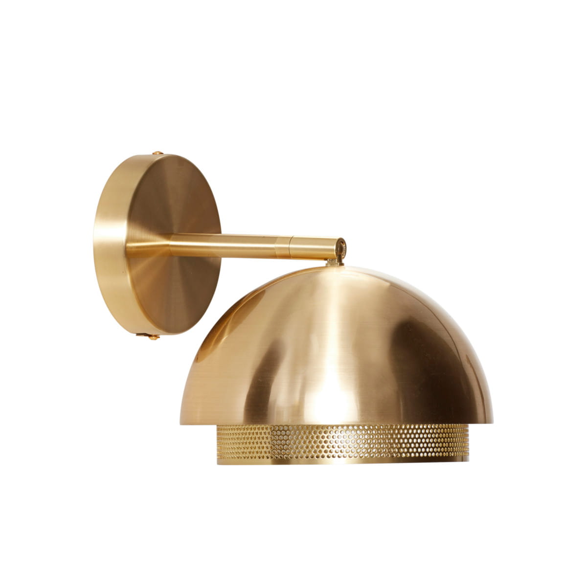The wall lamp SFERA has been designed by the Hübsch brand. The dome shaped shade makes the light spread evenly, and the small holes around the roundabout further soften the form of the lamp. The product is available in brushed brass and lacquered black.