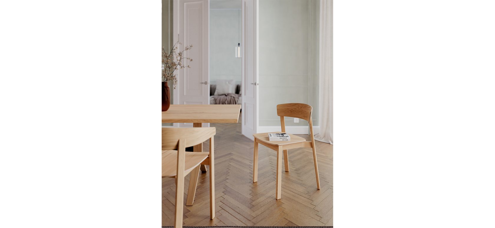 The furniture is made of simple elements, and the wide backrests of the armchair and chair are slightly suspended on structural elements.