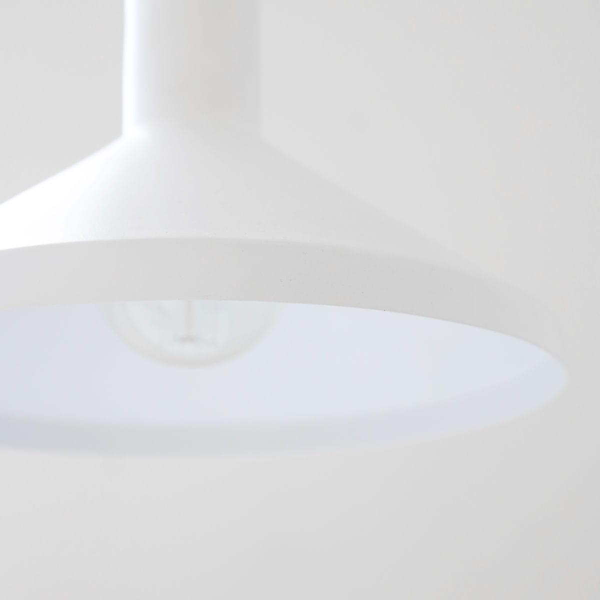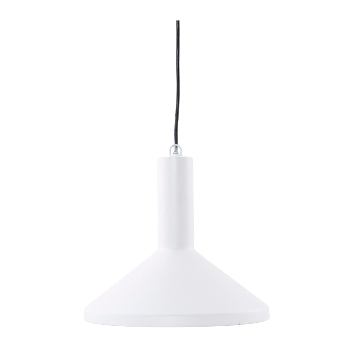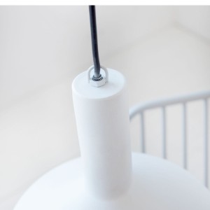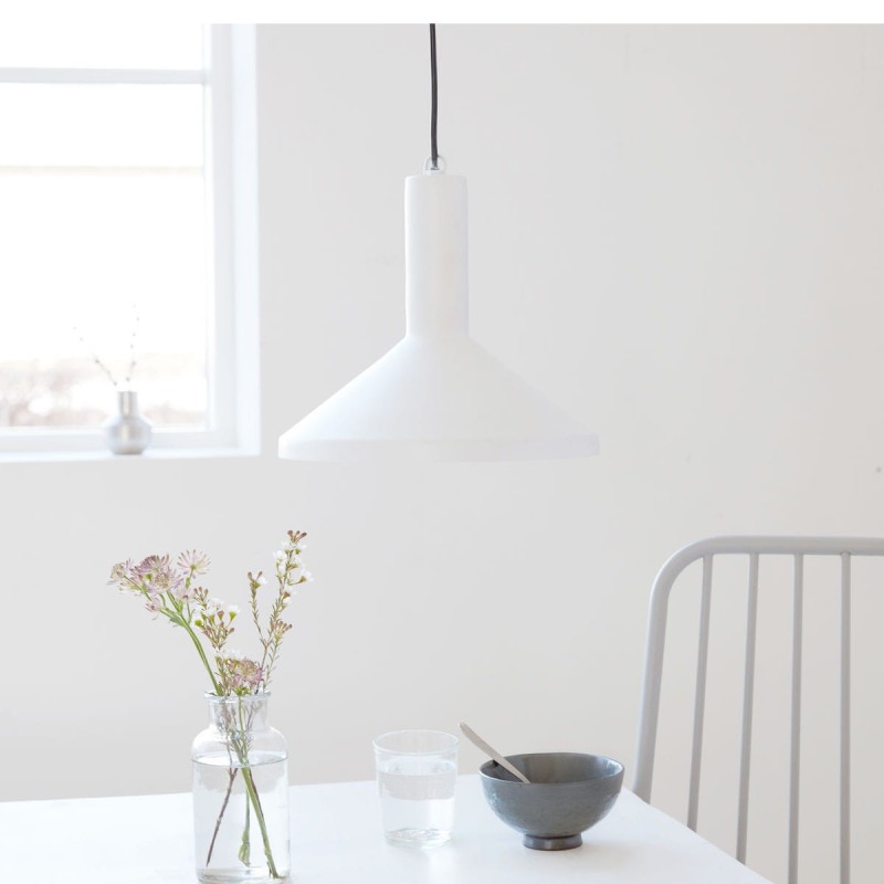 Minimalistyczna lampa wisząca MALL MADE marki House Doctor. Lampa została wykonana z metalu, lakierowana na kolor biały. Lampa została zawieszona na czarnym kablu o długości 2.5m.