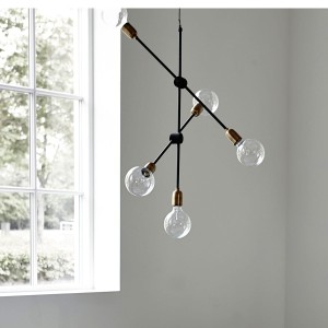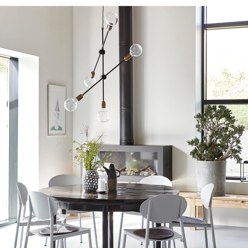 Lampy są ważnym elementem, gdy chcesz stworzyć osobisty i przytulny wystrój. Piękna lampa MOLECULAR firmy House Doctor to niemal lampa rzeźbiarska, która jest praktycznym źródłem światła, a jednocześnie daje dodatkowy akcent do Twojego domu. Lampa składa się z pięciu mosiężnych gniazd, które są przymocowane do regulowanych czarnych lakierowanych prętów. Lampa wygląda pięknie, niezależnie od tego czy jest włączona czy wyłączona. Umieść lampę nad stołem w jadalni, w rogu salonu lub użyj jej jako eleganckiego źródła światła w korytarzu. Żarówki nie są dołączone.