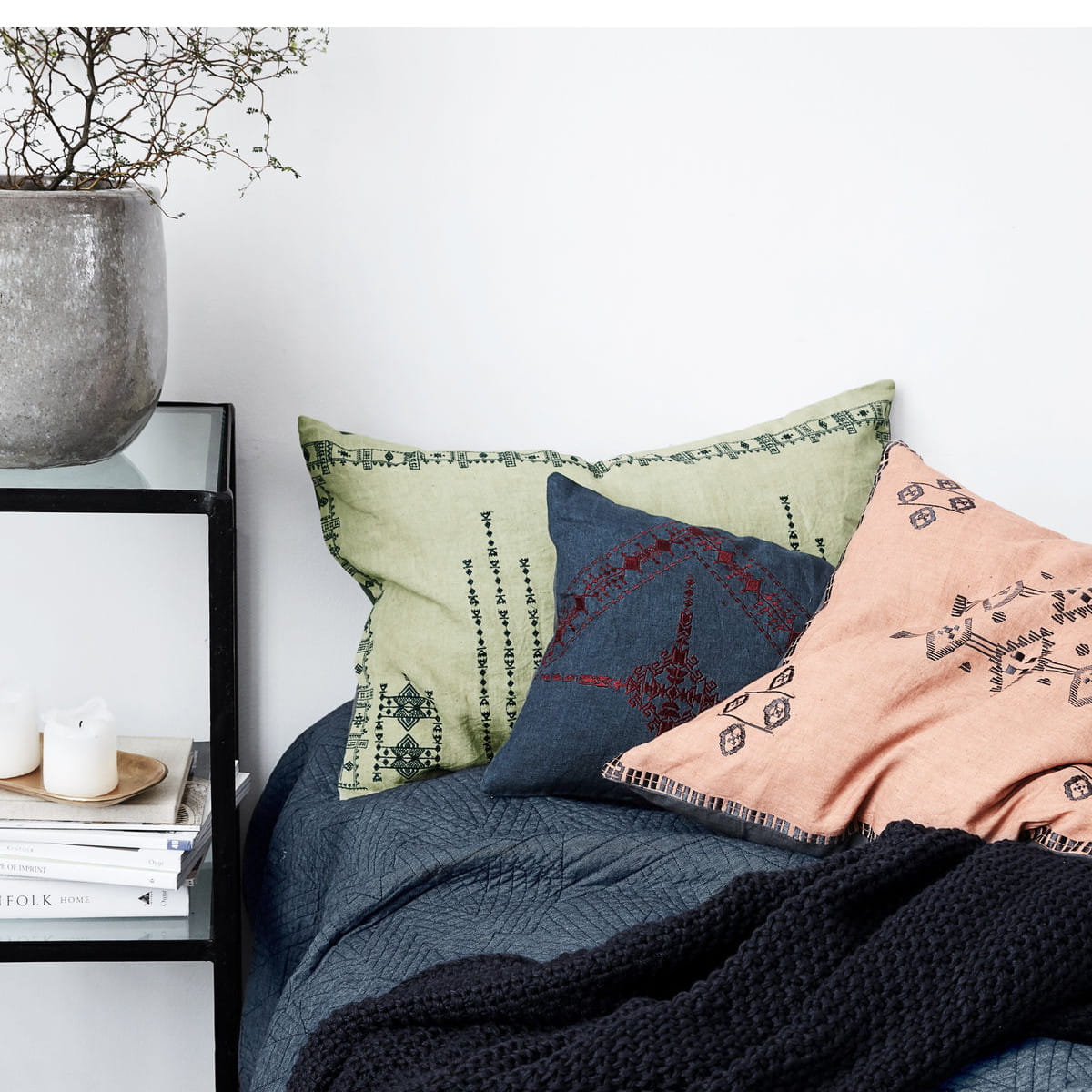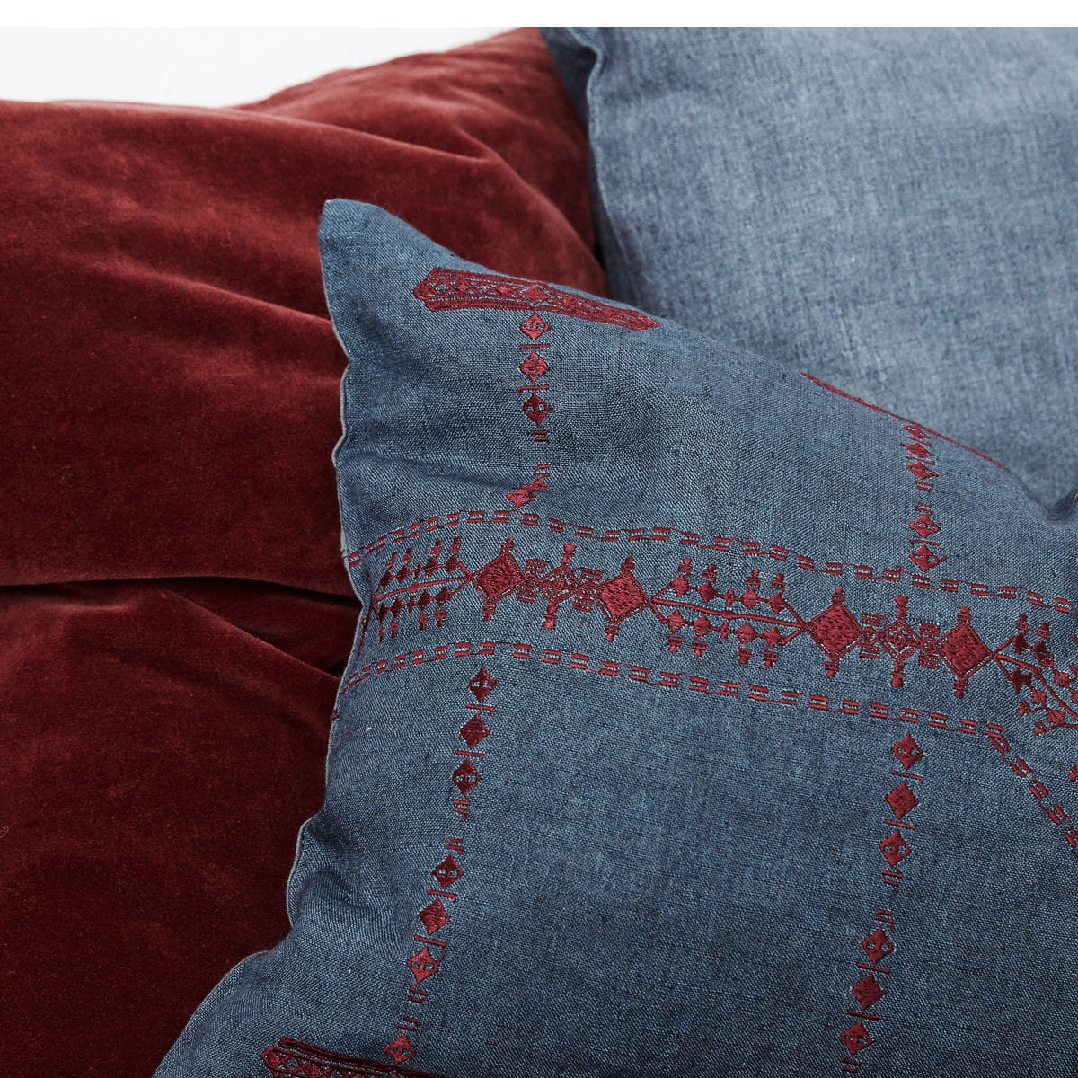 Poszewka na poduszkę w styli indi. Poszewka INKA BLUE została wykonana z lnu. Front w kolorze granatowym z burgundowym haftem idealnie skomponuje się z ciemną zielenią liści oraz z ciemnymi dodatkami. Tył poduszki w kolorze ciemnoszarym zapinany na zamek.