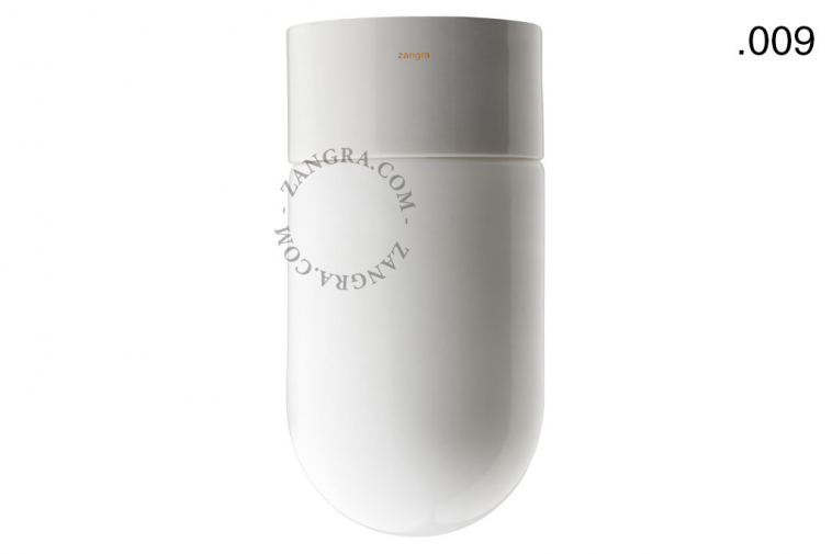 The bathroom ceiling lamp by Zangra is an option for those who appreciate the industrial and slightly retro character of the interior. The white porcelain fixture supports a white plastic shade. Made by hand in Belgium.